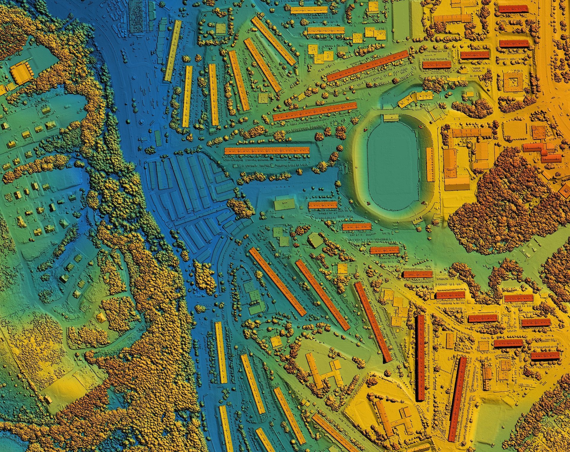 You will notice that even heavily wooded areas show accurate ground elevations, which is not possible with standard aerial photography. LiDAR captures the shape of the land beneath dense canopy, giving engineers and surveyors the base data needed for grading plans, flood modeling, and utility corridor routing. The data is spatially referenced and compatible with CAD and GIS software.